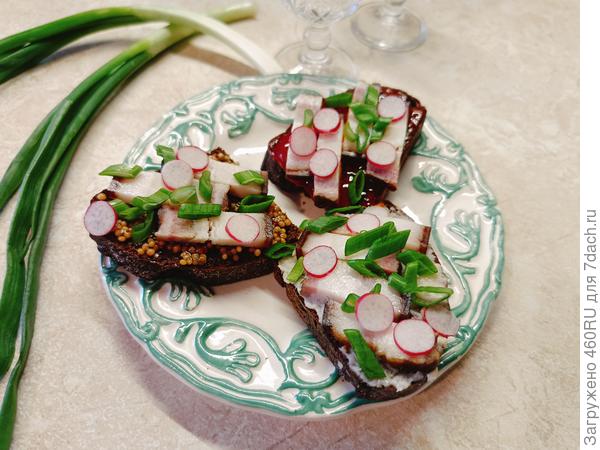 ИнгредиентыРжаной хлеб — 2 ломтикаКилька соленая — 4-6 шт.Сливочное масло — 1 ст. ложкаГорчица с зернами — 1 ч. ложкаРедиска, зеленый лук, укроп — для украшения