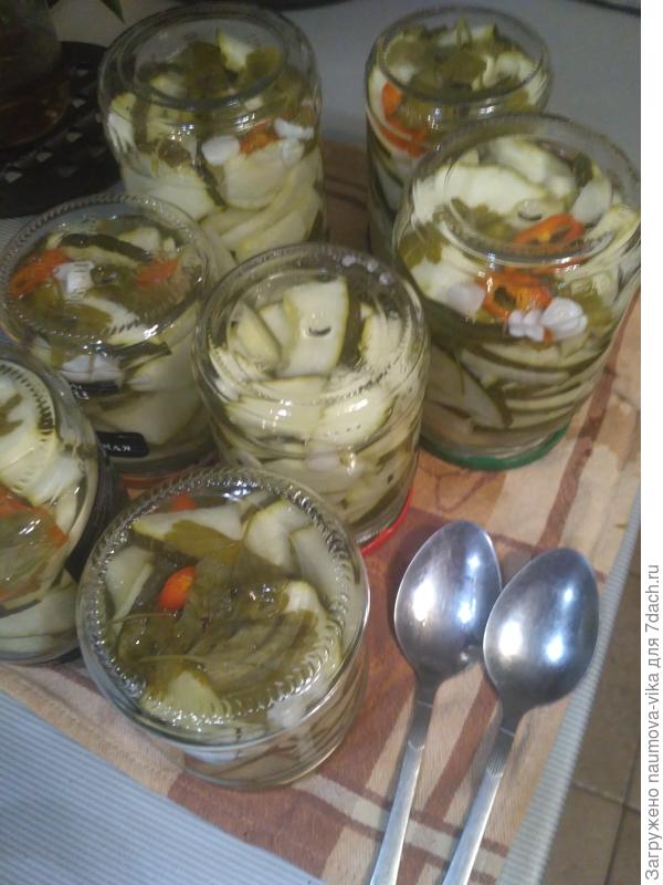 А если серьёзно, то что там можент быть невкусного? Обычные маринованные кабачки. Чеснок, соль, сахар, уксус — всё как в других маринадах. Я такие кабачки на работу беру. Всей кампанией съедаем пол-литровую банку.