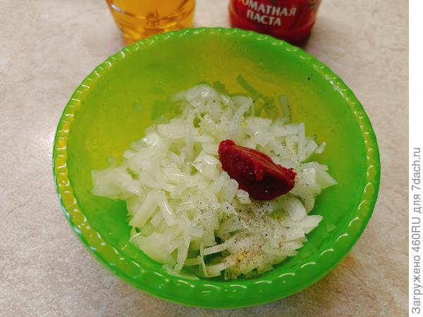 Промыть лук холодной водой, чтобы остановить процесс нагрева. Соль и сахар добавить по вкусу. Влить душистое подсолнечное масло и добавить томатную пасту. Не кетчуп, не соус, а именно пасту хорошего качества.