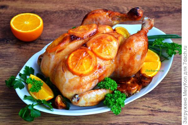 Под кожу на грудке положила колечки мандарина. В брюшко положила дольки 1 мандарина, плотно набивать не стоит. Связала ножки курицы кулинарным шпагатом.