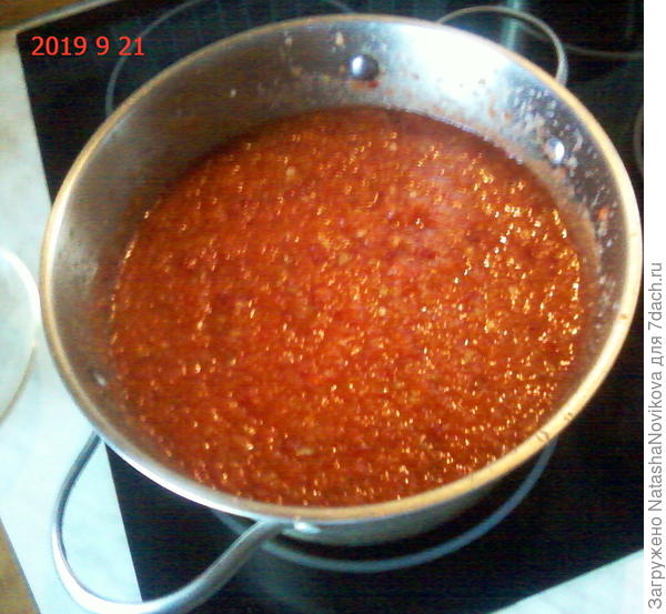 Наутро выделится много сока. Поставить кастрюлю на огонь и варить на медленном огне 30 минут, пока перцы и яблоки не станут мягкими.