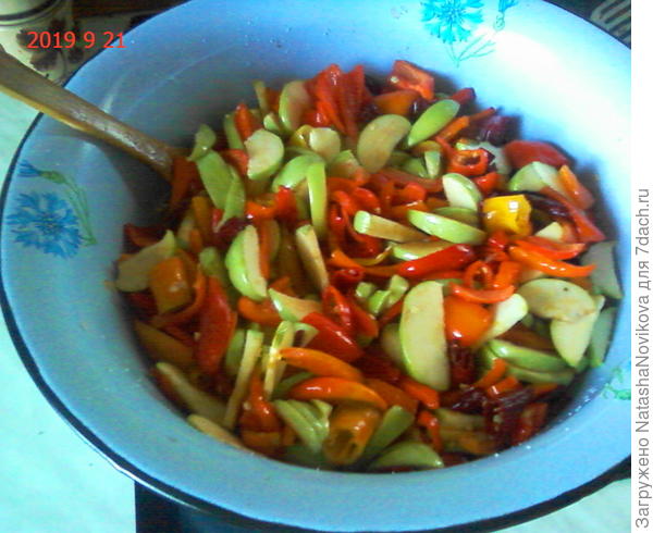 Засыпать кусочки яблок и перцев сахаром, перемешать и оставить на ночь.