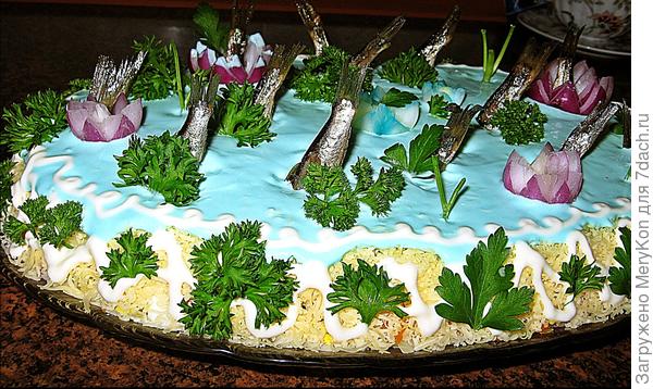 Я тоже иногда делаю салат со шпротами " Рыбки в пруду".