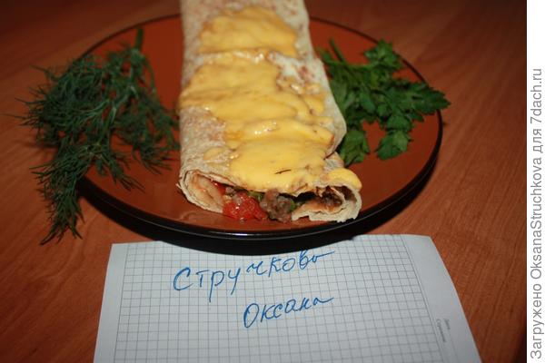 Я тоже готовила нечто похожее блюдо, только называется Бурито — мексиканская кухня! И хотела с вами со всеми поделится. Не буду писать полностью рецепт, на фото и так все видно, хотела бы только добавить, что мексиканцы соус делают в основном из белой или красной фасоли.