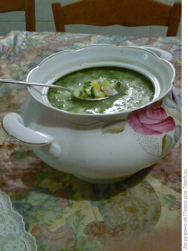 На другой день собрала остальные компоненты для окрошки – огурец из теплицы, зелень с грядок, последние две картофелины сварила в кожуре, сбила майонез из свежеснесённого яйца, ещё три яйца сварила, чтобы покрошить. Всё накрошенное залила смесью берёзового кваса и напитка «тан». Это вместо сыворотки, мне так показалось вкуснее.