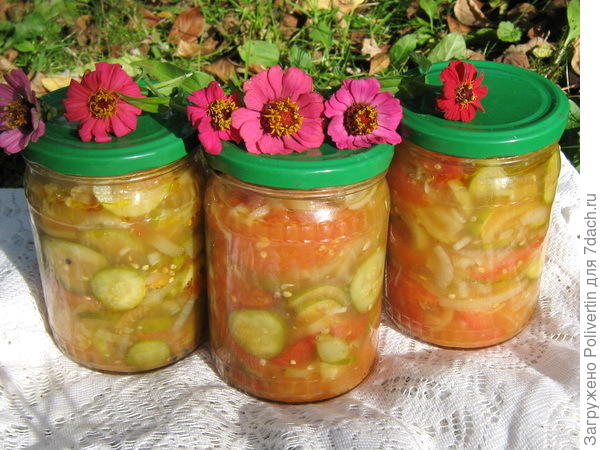 Разложить салат в полулитровые банки, добавить в каждую по столовой ложке уксуса (у меня разведён до 7%) прикрыть крышками и поставить стерилизовать.