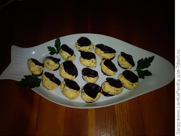 Осталось сложить половинки каждой черносливки, придав форму раковины, чтобы с одной стороны начинка оставалась открытой. И можно укладывать наши «мидии» на блюдо и подавать к столу! Теперь верите, что 30 минут для приготовления такой закуски даже много?