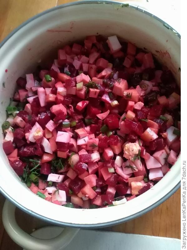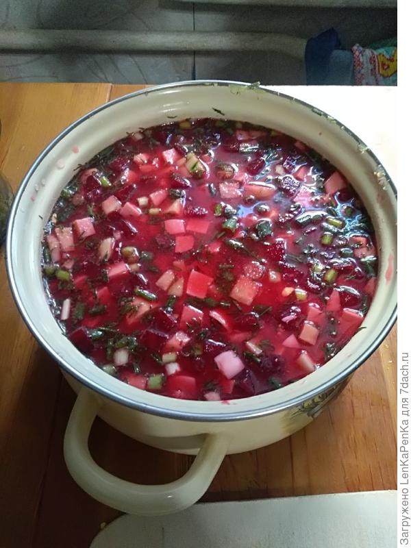 . Только свеклу отвариваю накануне со специями и уксусом, вот и " бульон" готов, только остудить