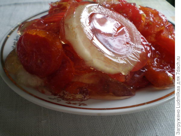 Помидоры дольками или по-другому «Пальчики оближешь» в желе, этот старый рецепт, его еще в советские времена делали. Я потом просто перестала класть желатин, делала без него., смысла большого в нем нет. Все на столе быстро тает. По вкусу разницы нет.