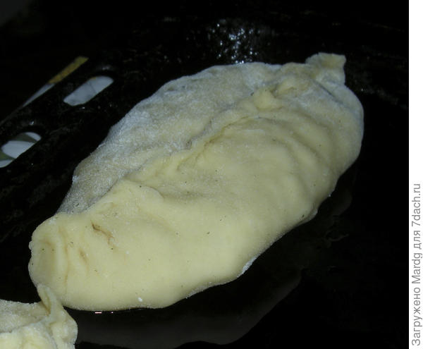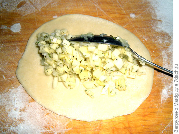 Берем кусочек теста ( как 2 грецких ореха), раскатываем скалкой, кладем начинку и защипываем пирожок.