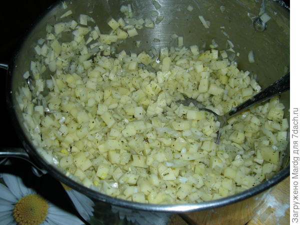 Масло растапливаем и смешиваем с яйцами, сметаной, сливочным маслом, солью и мукой.Режем лук и картошку очень мелкими кубиками, порежете крупно — долго будет готовиться.