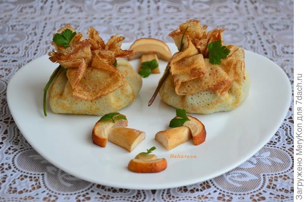 4. Можно из блинчика сделать мешочек и наполнить его творогом с изюмом.