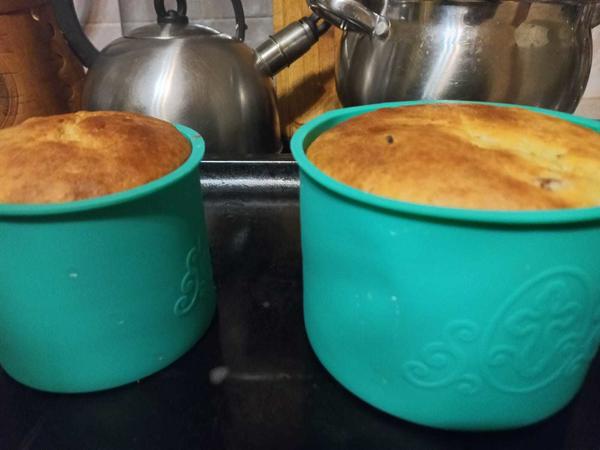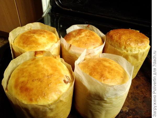 Раскладываем тесто по формам. Формы заполняем меньше чем наполовину, потому что тесто сильно поднимается. Делаем в центре углубления, кладем в них по небольшому кусочку масла и ставим в теплое место (я ставлю в слегка подогретую духовку). Когда тесто поднимется, отправляем в разогретую духовку на примерно 40 минут (время зависит от размера форм) при температуре 180ºC. Готовые куличи слегка остужаем.