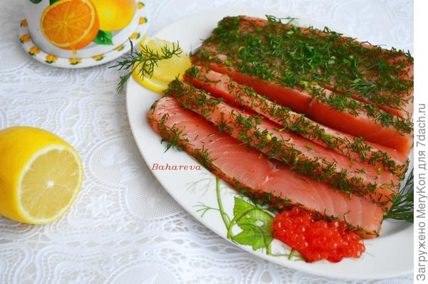 Рыбу нужно хорошо промыть и обсушить. Тешу (нижнюю часть брюшка) срезать. Теперь семгу разделить на две части вдоль, удалив при этом хребет и все косточки (хорошо помогает пинцет). Положить филе на лист фольги внутренней частью вверх. Сбрызнуть оба куска бренди, затем смазать маслом. Смешать сахар, соль, укроп и перец. Выложить эту смесь на филе ровным слоем и накрыть вторым куском. Сложить рыбу нужно так, чтобы филе было внутри, а кожа снаружи. Хорошо прижать и завернуть рыбу в фольгу, сложить в любую удобную посуду и сверху положить гнет. Положить рыбу на ночь в холодильник, затем перевернуть и оставить еще на сутки, перевернув еще пару раз. Затем рыбу развернуть и… можно нарезать ломтиками. Вкуснотища необыкновенная!