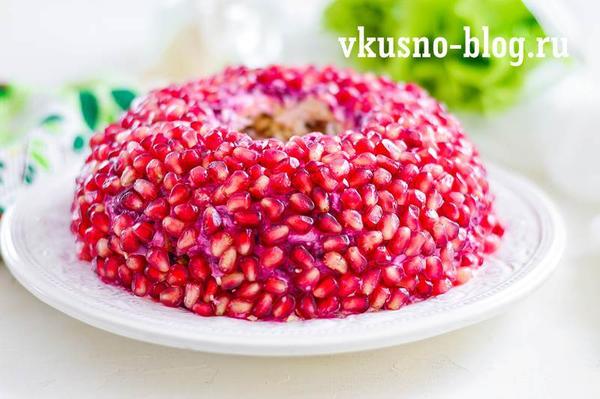 Я очень люблю зерна граната вообще, а в этом салате в частности, поэтому салат завершаю плотным слоем. Если вам не очень нравятся гранатовые зерна — то можно посыпать их редко.
