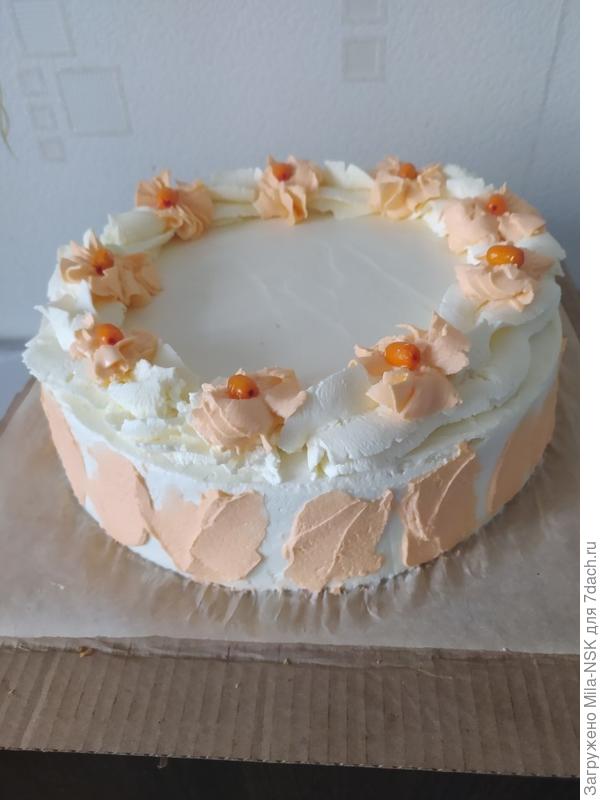 Как видите, внутри спряталась вкуснейшая облепиховая начинка. Она окружена мягким сочным бисквитом, а венчает этот «Подарок осени» двухцветная сливочная шапочка