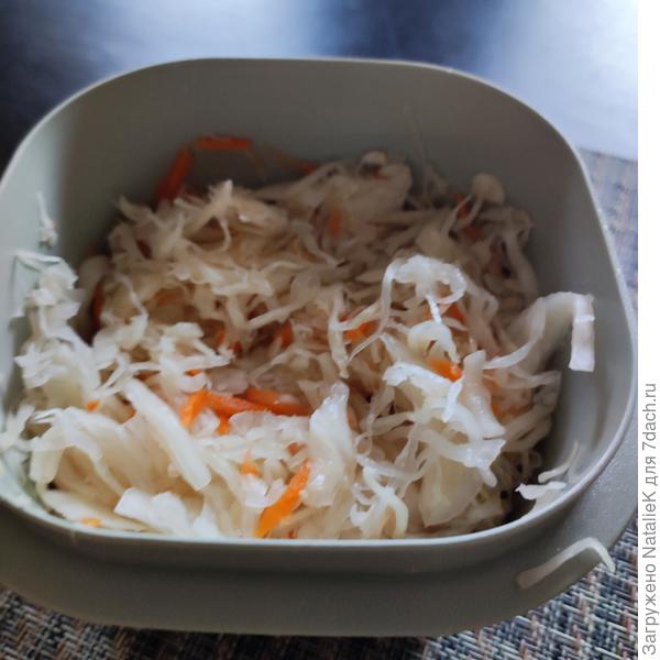 Нашинковали капусту, натерли морковку, пересыпали солью. Пожамкали (простите за сленг) так, чтобы она дала сок.