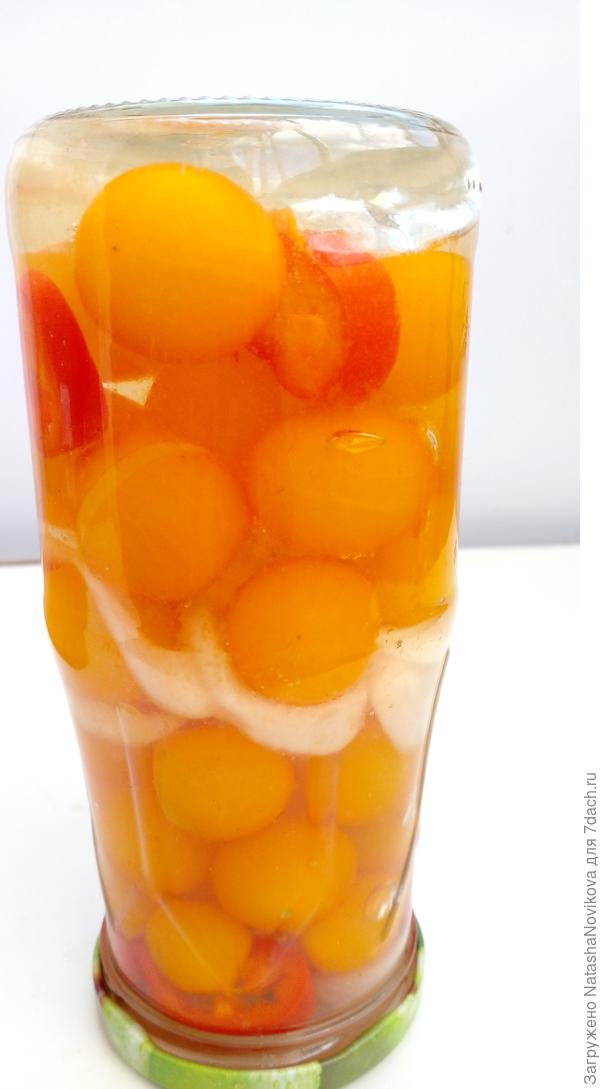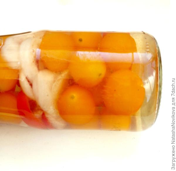 Все необходимые овощи нарезаю колечками, каждый томат черри прокалываю около плодоножки зубочисткой, чтобы томаты не растрескивались при заливке в баночки.
