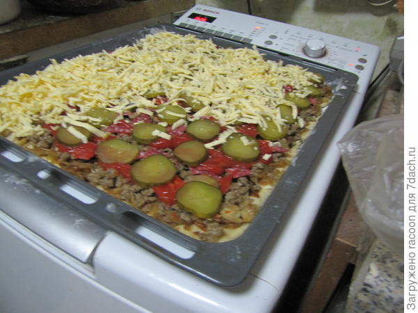 В этом декабре тестовую пиццу я приготовил с новой начинкой. Фарш + копченая колбаса. Говяжий фарш сначала был пожарен с луком. А поверх фарша положил кусочки колбасы. Остальные ингредиенты остались прежними. Укладываем по порядку. Слой жареного лука, слой фарша, посыпаем кусочками колбасы, кетчуп, слой соленых огурцов… Всю эту красоту накрываем натертым сыром и ставим противень с пиццей в духовку…