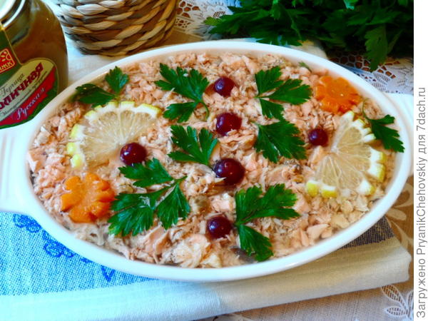 Украсить дольками лимона, клюквой и петрушкой.