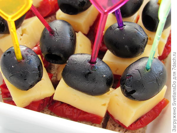 - Осталось собрать бутерброд — сначала оливка, потом помидорчик, затем сыр.