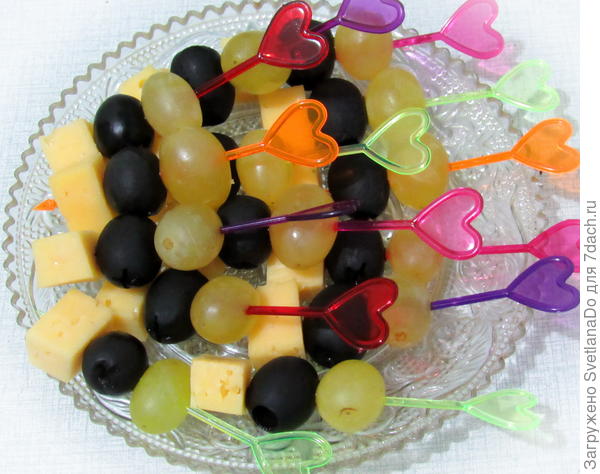 Все, наша очаровательная вкусная закуска готова! Дополнительный плюс этого рецепта — не придется ломать голову над основанием для шпажек: сырные кубики отлично справятся с этой ролью.