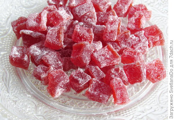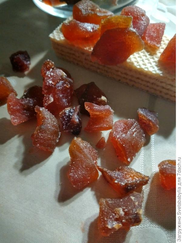 Мне в прошлом году с тыквой немного не повезло: оказалась очень спелая, что ли… Или сорт «не тот»… В общем, она в сиропе моментально разваривалась — получился джем вместо цукатов. Правда, у меня и джем не залежался