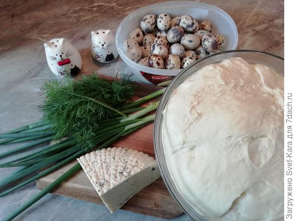 Натрем брынзу на тёрке. Добавим мелко порезанные укроп и лук, сметану и перепелиные яйца. Все перемешаем.