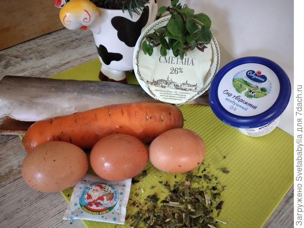 Треска свежая, картофель и яйца вареные, сыр твердый, сметана, сливки, грибы (у меня белые, заморозка), лук репчатый, соль, перец душистый, лавровый лист. Для украшения черри, лимон, зелень.