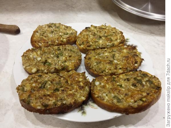 Думаю если с начинкой не запекать, то укладывать её лучше на тосты. А начинка, для которой не хватило хлебушка, очень неплохо идет и без него)