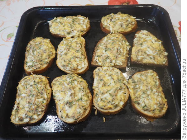 В этот раз у меня получилось 12 бутербродов. Но начинку вполне можно было распределить еще по 2-3 ломтикам батона (не захотела из-за двух-трех штук использовать еще один противень :).