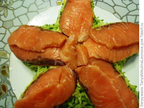 1. Свежие огурцы разрезать вдоль ( 5 полосок) и выложить на блюдо в виде звезды. Это основа салата.