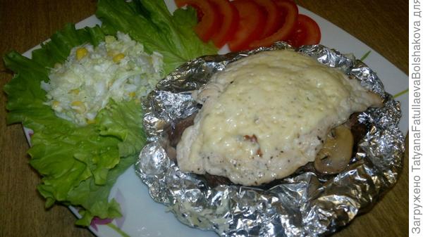 Подаем на большой тарелке прямо в фольге. Мясо раскрываем и наслаждаемся вкусом!
