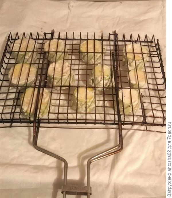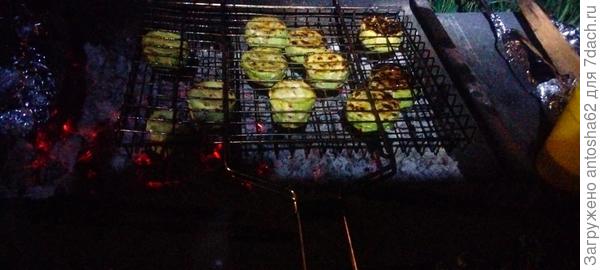 В это время подготовить мангал. По истечении одного часа поставить решетку на мангал, периодически переворачивать ее. Довести кабачки до готовности.