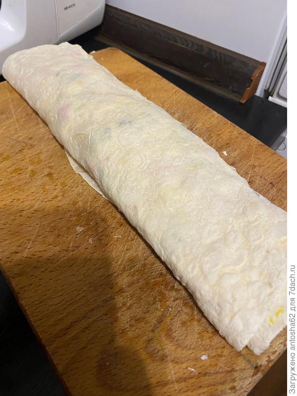 Укладываем начинку на лист лаваша и сворачиваем его в рулет.