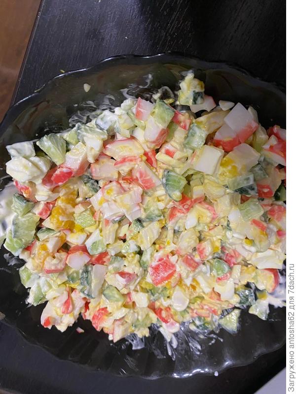 Крабовые палочки, отварные яйца и огурец нарезаем небольшими кубиками. Добавляем к ним раздавленный чеснок, майонез и все перемешиваем. Солим по вкусу.