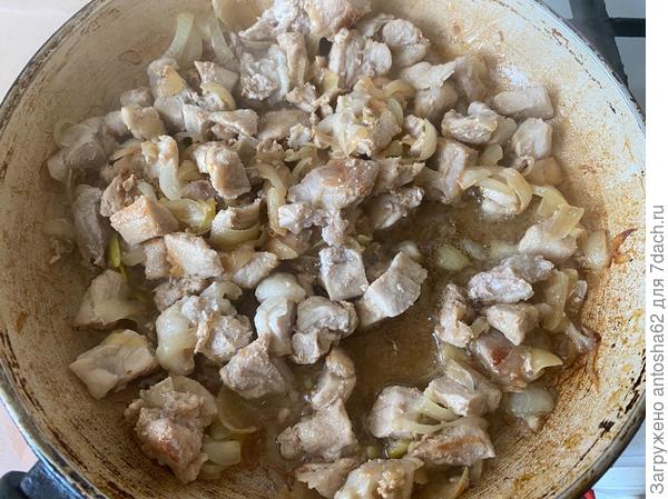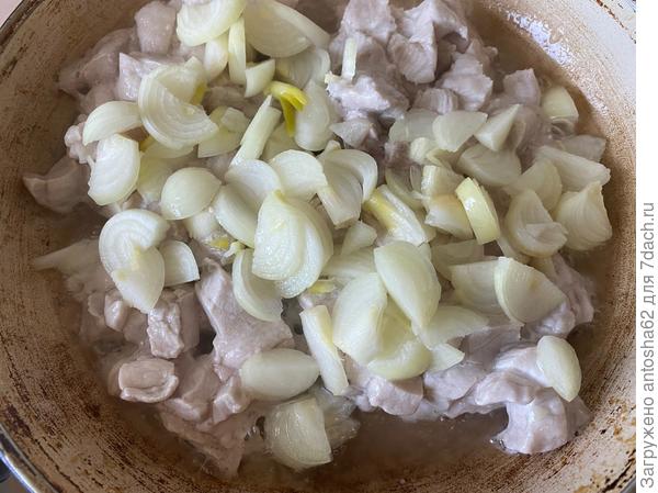 Затем соединяем с нарезанным луком и начинаем тушить наши ингредиенты, подсаливая их.