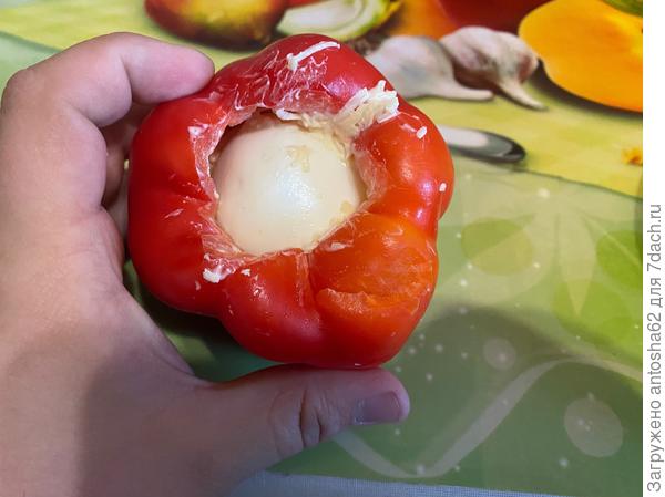 Помещаем внутрь перца отварное куриное яйцо.