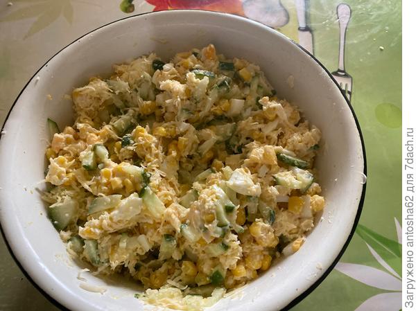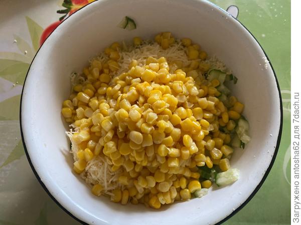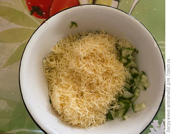 Сыр трем на мелкой терке, соединяем с нарезанным огурцом.