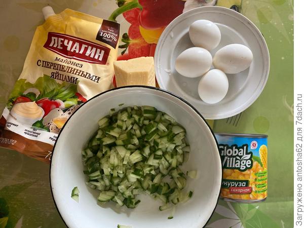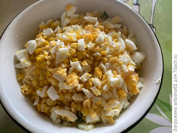 Яйца режем кубиками и также соединяем с остальными ингредиентами.