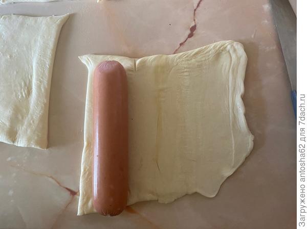 Затем разрезаем на небольшие квадратики. Помещаем сосиску на квадратик теста и закручиваем его.