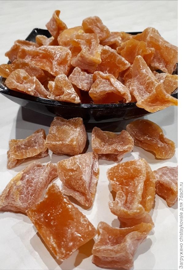 Сейчас уже понимаю, что, наверно, тыкву надо было резать помельче. Сразу мои цукаты не просохли, поэтому досушивала их ещё 6 часов при той же температуре.