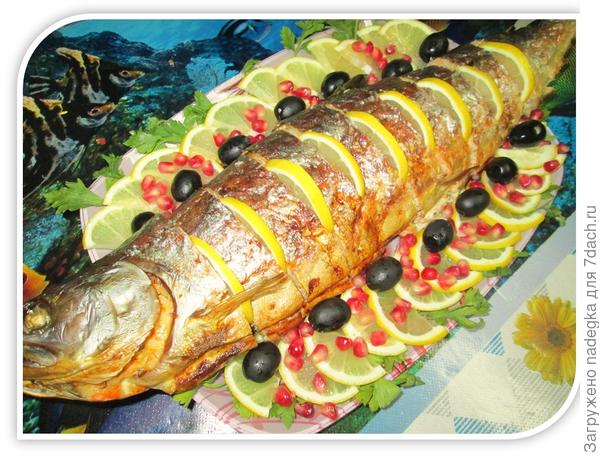 Чтобы рыба осталась сочной при выпекании, завернем ее в фольгу. Но не полностью, верх оставим открытым, для того чтобы рыбка не прилипла к фольге и смогла подрумяниться. Запекаем 15 минут, а затем вливаем немного воды и снова в духовку минут на 20. Лучше отслеживать готовность блюда по степени зажаривания корочки. Как только она станет золотистой и пойдет аппетитный аромат рыбки, значит готово, вынимаем из духовки.