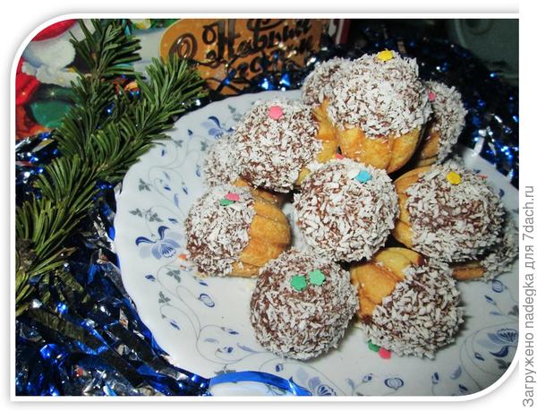 Обмакнуть готовые орешки на половину в растопленный шоколад. Затем в кокосовую стружку.