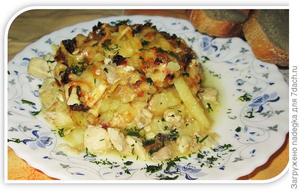 Сверху на картофель выложить грибы с луком. Влить немного бульона или воды с бульонным кубиком (при желании можно добавить сливки). Поставить в духовку, нагретую до 200с, минут на 20.