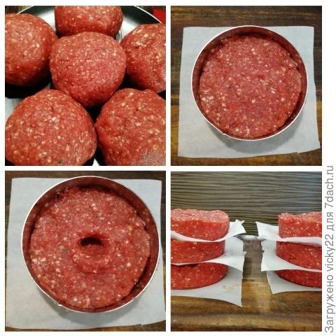 Фарш разделяем на одинаковые заготовки. Утрамбовываем через кулинарное кольцо и делаем в центре углубление. Так наши котлеты получатся аккуратными и не вздуются. Этот способ я использую и при приготовлении обычных котлет.