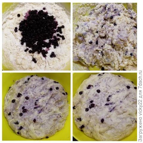 Всыпаем размороженную чернику, замешиваем мягкое, не липнущее к рукам тесто. При необходимости добавьте еще муки.