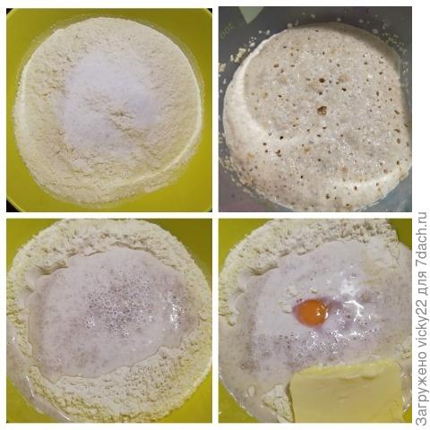 В муке делаем воронку. Вливаем дрожжевую смесь в муку, разбиваем яйцо и добавляем сливочное масло комнатной температуры. Смешиваем яйцо с дрожжевой смесью и маслом вилочкой прямо в воронке.