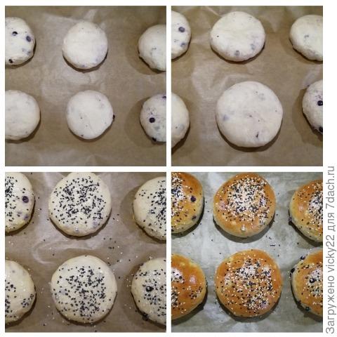 Подошедшее тесто делим на одинаковые заготовки, выкладываем на противень и немного придавливаем. Оставляем на 10-15 минут.