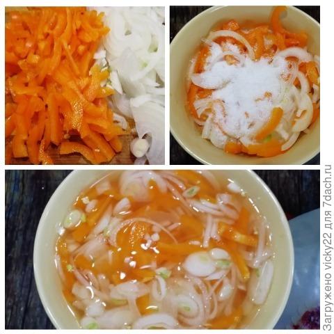 Болгарский перец и лук тонко нарезаем и маринуем с солью, сахаром, уксусом и водой 15-20 минут.